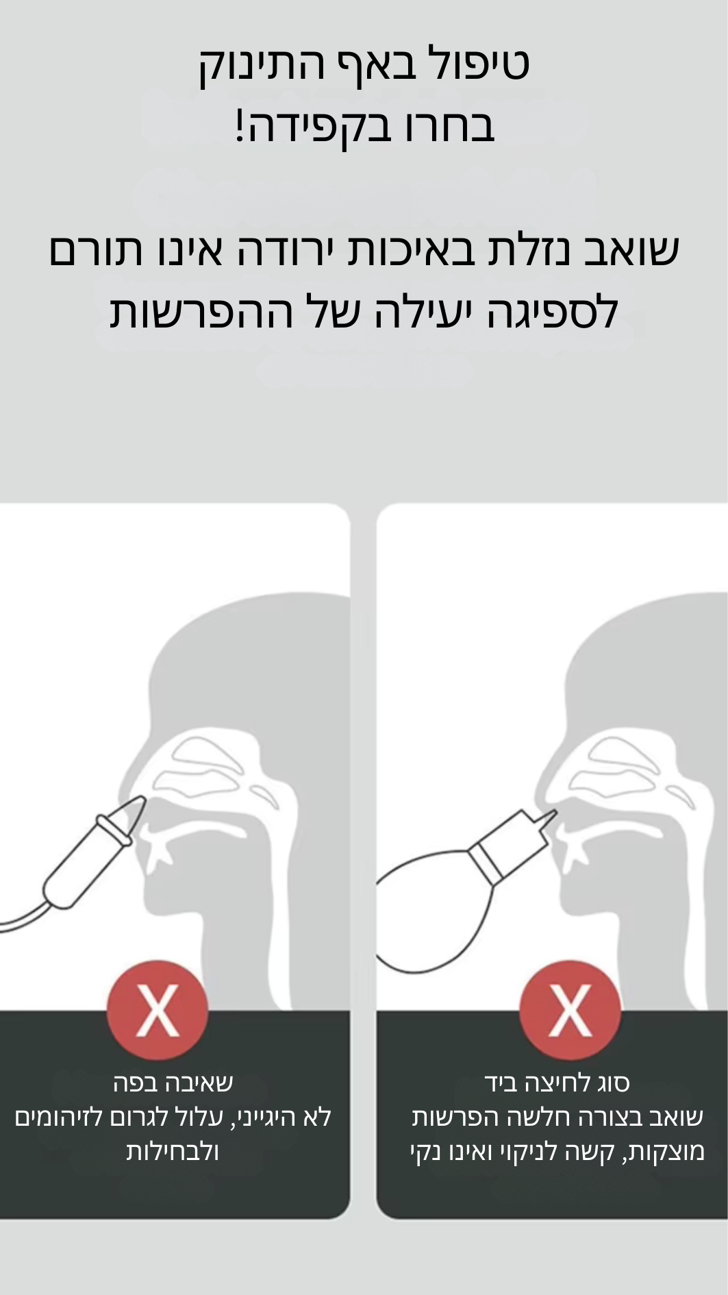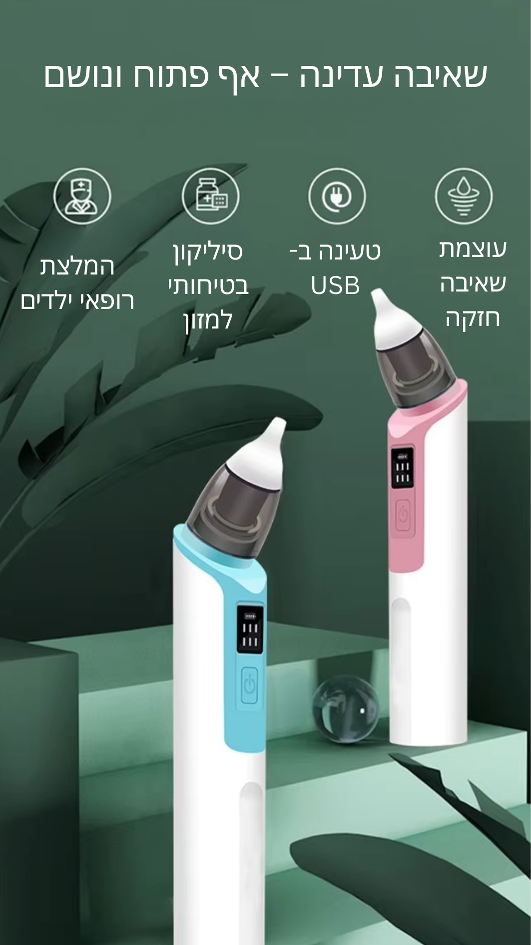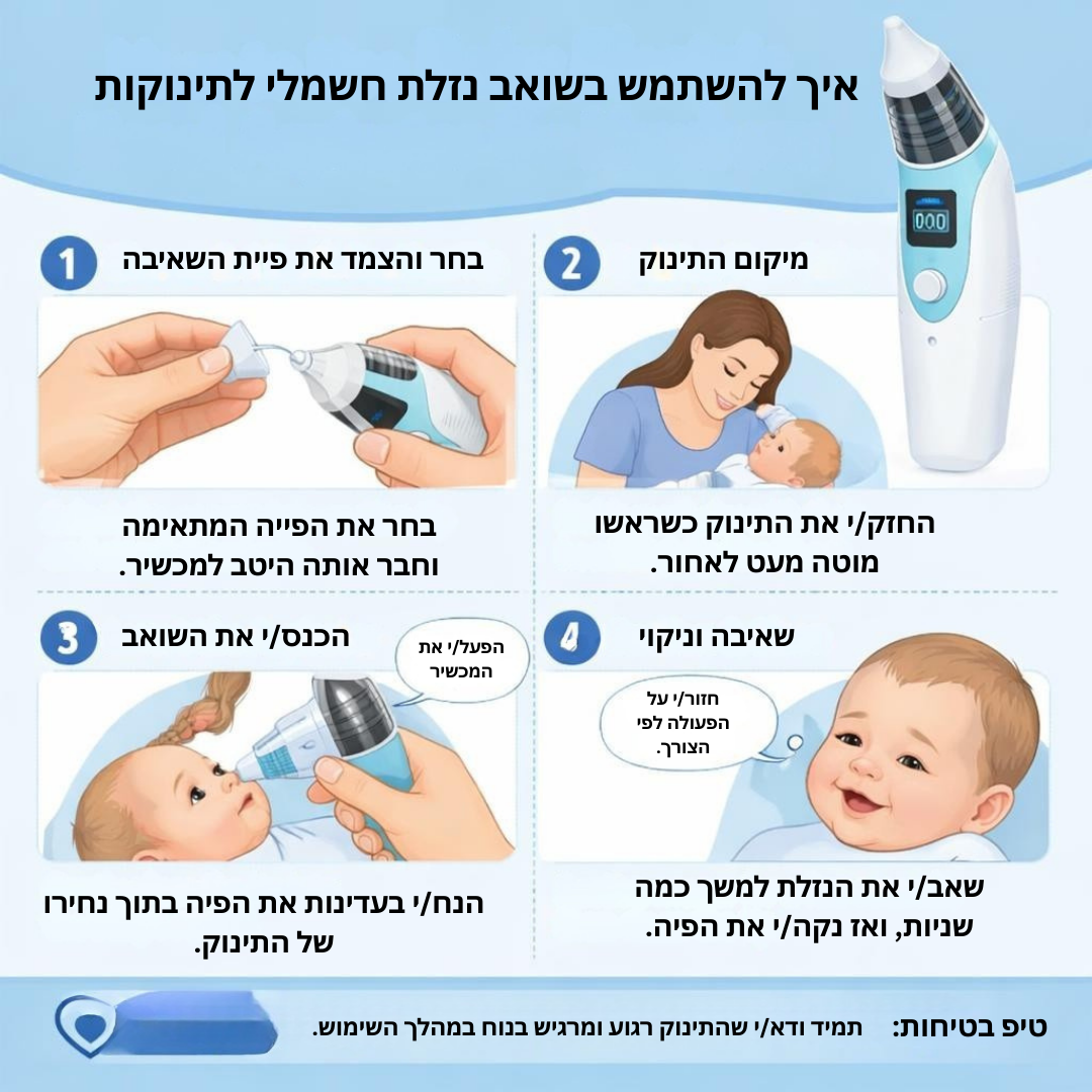 מכשיר קטן, בטיחותי ויעיל, שנועד לשאוב נזלת ולהקל במהירות על גודש באף של תינוקות.
